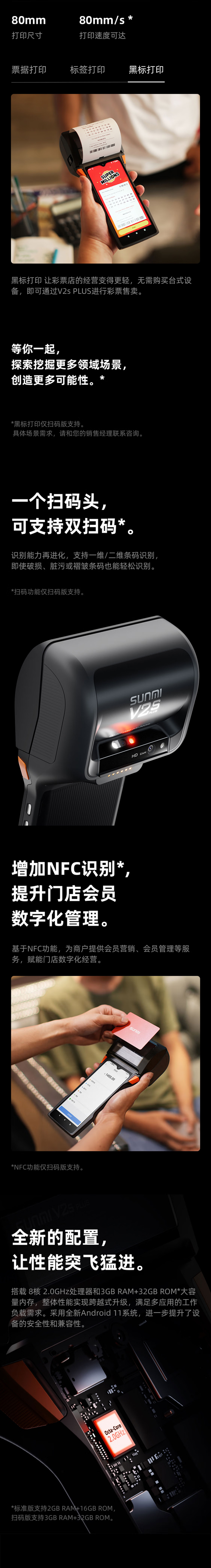 三种打印类型,支持票据、标签、黑标*三种打印方式,宽度为80mm纸卷,打印速度升级至80mm/S。7.7V/3500mAh大容量可拆卸电池,全天候职守,毫不费力。7.7V/3500mAh大容量电池,充满次电,可待机14天*、持续工作>16小时* ,全天工作无忧。可拆卸电池设计,保证长时间的续航能力,提供持久生产力。...