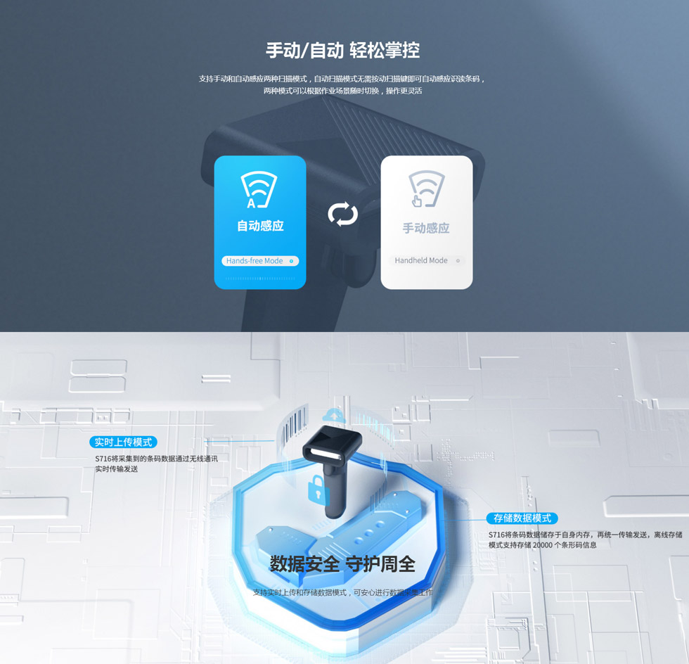 优博讯S716_无线条码扫描枪,支持蓝牙+无线传输两种连接方式。兼容Windows 、Android、Linux主流操作系统。内置2200 mAh 电池,满电状态下可支持连续工作12 小时。广泛应用于商超零售、快递物流、仓储、银行、医疗机构等行业场景中。...